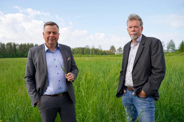 Pedersören kunnanjohtaja Stefan Svenfors ja kunnan konserniyhtiön toimitusjohtaja Kjell Gripenberg keskellä niittyä, jolla kasvaa tulevan biokaasulaitoksen raaka-ainetta.