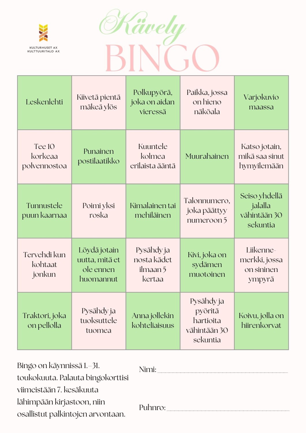 Inom projektet Aktiv gemenskap vill vi inspirera seniorer till mer rörelse. I maj månad kan alla seniorer över 65 år i Pedersöre delta i promenadbingo i sin egen by. Motionen börjar redan när du hämtar bingobrickan!