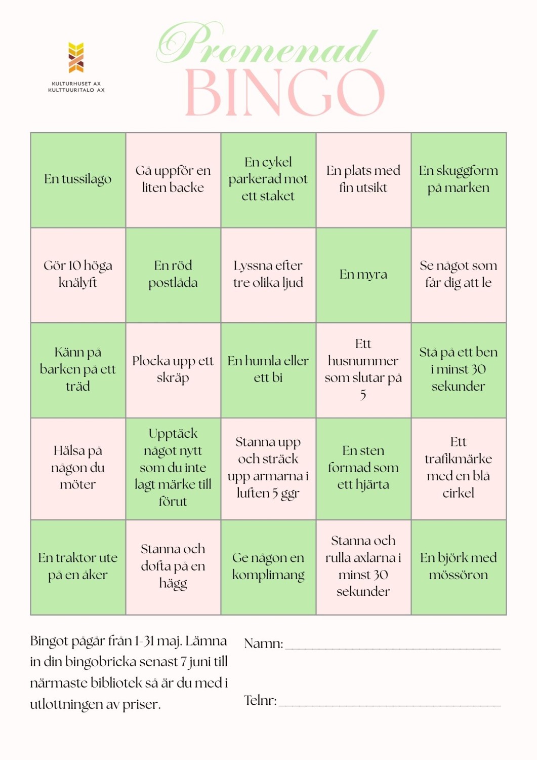 Från och med 1 maj kan du hämta en egen bingobricka och instruktioner från 16 motionslådor runt om i kommunen. Du kan genomföra promenadbingot en eller flera promenader, och det pågår hela månaden.